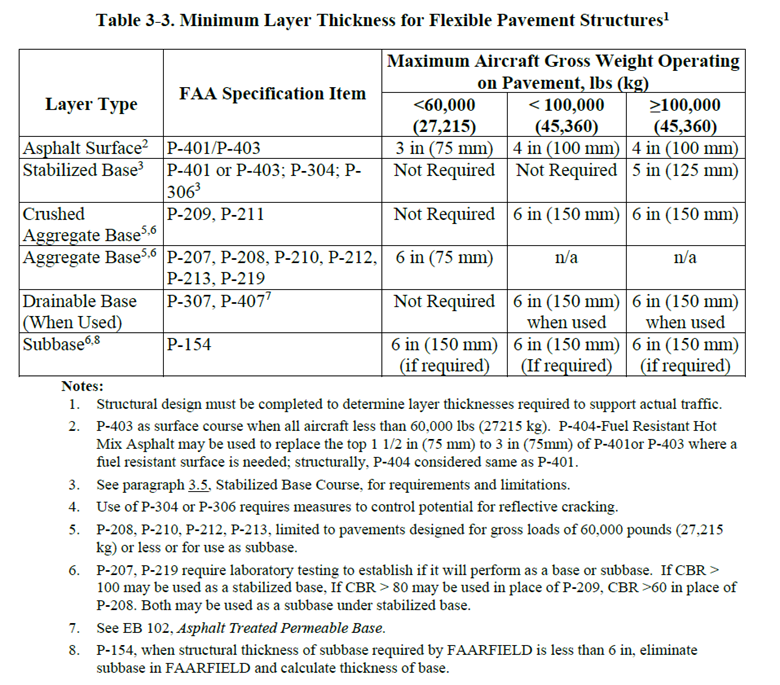 Remember that all of these are minimum recommended thicknesses, many larger airports that handle heavy commercial aircraft have pavement thicknesses greater than 30” in order to handle the heavy loads. The exact thickness is dictated by the FAARField program based upon the factors we have already discussed like soil suitability and the CDF.