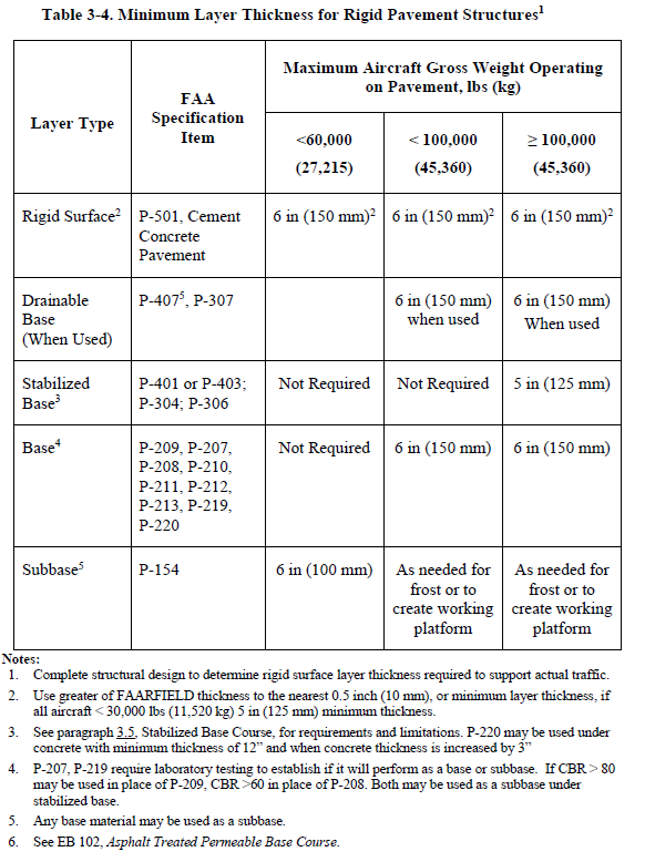 For rigid pavements expected to serve aircraft generally less than 60,000 pounds, the minimum pavement section consists of a 6” subbase and a 6” concrete surface course, for a 12” total pavement section.