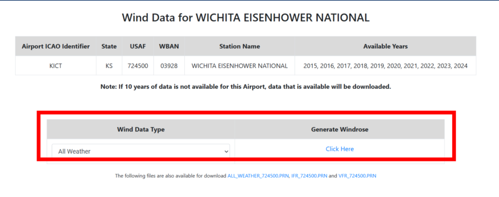 From there, you can download wind data from the nearest location to your airport. As an example, let’s assume that we want to build a new airport near Wichita Kansas. Once you click on the ‘Download Wind Speed Data’ link in ADIP, you need to select the area or the closest airport LOCID to retrieve the wind data. The LOCID for Wichita is KICT, so I’ll put that in the search form, the form works best if you use the K in front of the LOCID.