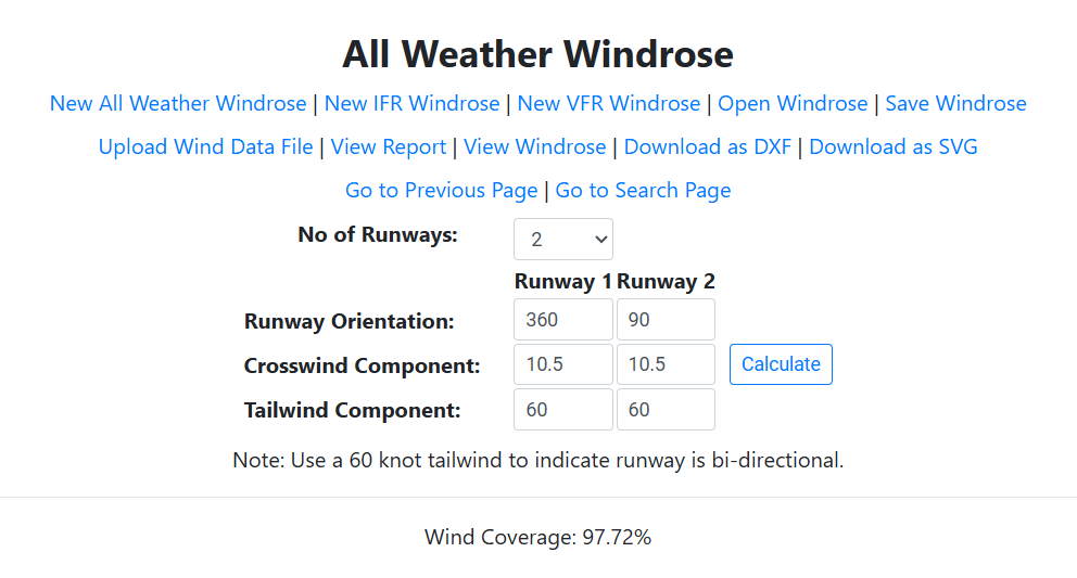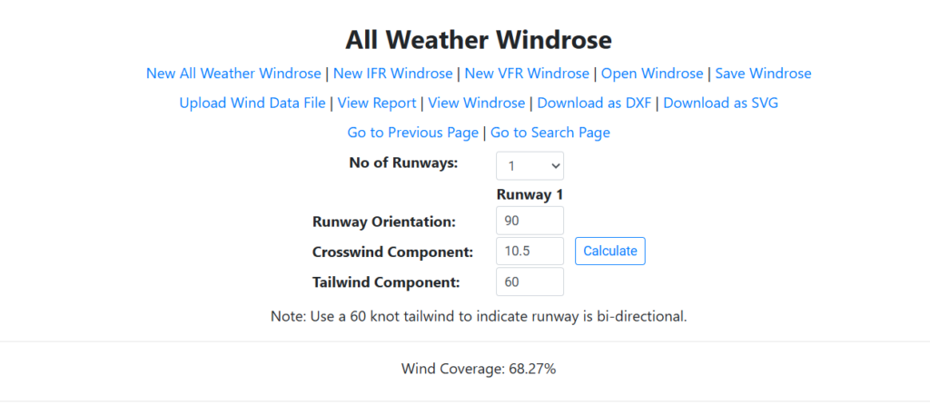 Let’s try at first to enter a runway direction of 90 degrees, which would create an east-west runway, the ADIP system now shows that the wind coverage for that orientation is only 68.27%. Not quite good enough.